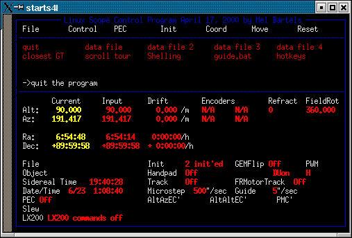 The software is event driven by either keyboard or hand paddle input. If no events occur, then the scope moves to the current equatorial coordinates. If the coordinates remain unchanged, the scope tracks. If new coordinates are entered, the scope slews. Slews can only be interrupted by pressing or releasing a button on the handpad, and by the keyboard, and by the altitude or azimuth limits if the interrupt driven halfstepping option is turned on. Tracking should be paused if hot-keying out to another program. When the program is exited, the scope's altazimuth coordinates are saved along with any initialized positions.